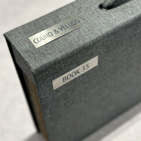 O terceiro mostruário da coleção de tapeçaria reúne uma coleção de artigos em couro e veludo, como couro ecológico clássico, veludo couro status, veludo imperial, veludo klin (impermeabilizado), veludo original, veludo suave, veludo composê e muito mais.